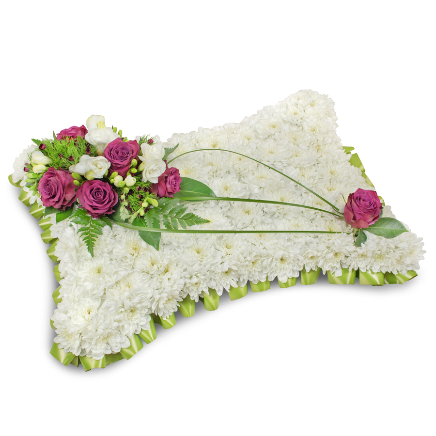 Our pillow-shaped arrangement elegantly combines white chrysanthemums, purple roses, white freesias, dianthus, and bear grass. This refined bouquet embodies love and peace, providing a meaningful way to extend your heartfelt condolences.